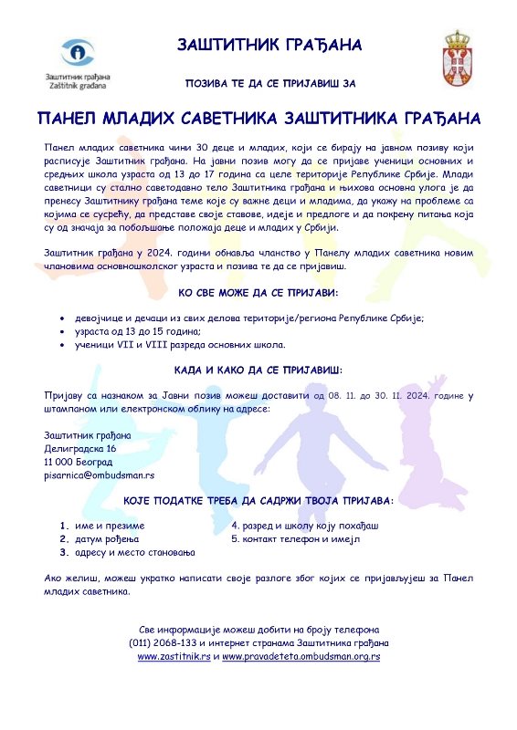 Панел младих саветника Заштитника грађана упућује јавни позив свим ученицима основних школа у Србији за учешће деце и младих у раду ове институције. Основна улога Панела је да пренесе Заштитнику грађана теме које су важне деци и младима, укаже на проблеме са којима се деца сусрећу, представи ставове, идеје и предлоге деце и покрене питања која су од значаја за побољшање положаја деце и младих у Србији. Јавни позив ће бити отворен од 08. до 30.11.2024. године.