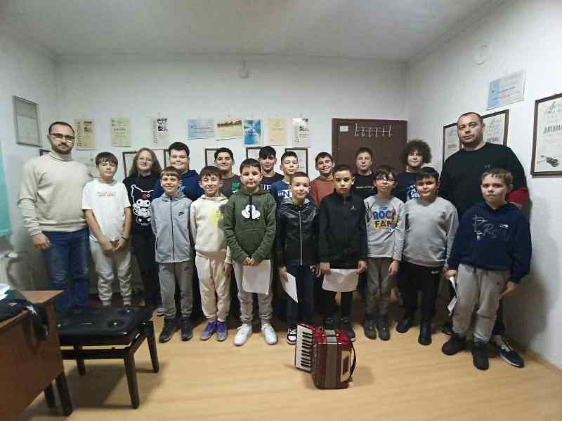 Наставници хармонике Милош Стоименов и Предраг Јанковић интерни час са ученицима своје класе, у просторијама школе.